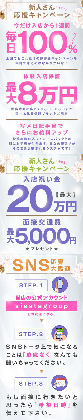 交通費無料 (3000円まで) 新店オープン予定のため 期間限定で交通費無料! 90分¥19,000 120分¥27,000 180分¥38,000 ※指名は+1,000